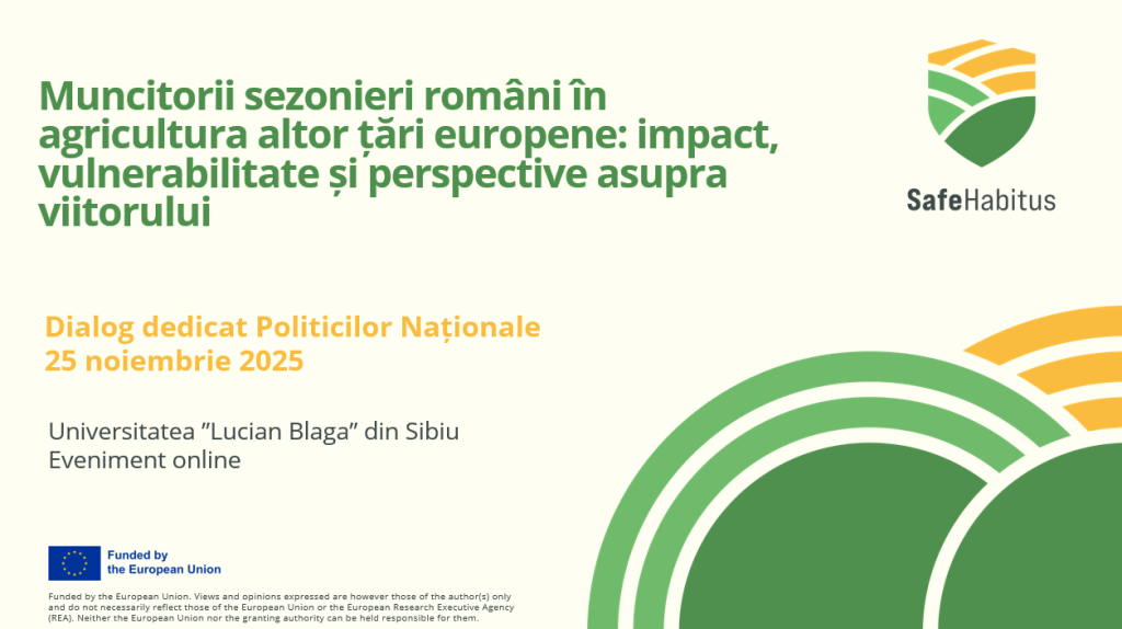Evenimentul online, organizat de Universitatea „Lucian Blaga” din Sibiu prin reprezentanți ai Facultății de Științe Socio-Umane, a reunit în 25 noiembrie 2025, o serie de actori relevanți pentru discutarea cadrului de politici și programe pentru acest registru tematic: reprezentanți ai unor instituții publice din România, sindicate, organizații non-guvernamentale din România și din străinătate, cadre didactice și cercetători cu experiență din mai multe centre universitare. În deschiderea întâlnirii, a fost realizată o prezentare a proiectului SafeHabitus și a obiectivelor pe care acesta le are legate de munca agricolă în plan național și european. De asemenea, echipa SafeHabitus a prezentat o serie de rezultate preliminare derivate din raportul de țară elaborat pe tema migrației sezoniere din România pentru munca în agricultura altor state europene. În acest cadru, a fost discutat profilul de vulnerabilitate și costurile socio-economice semnificative pe care migrația sezonieră le generează atât la nivel individual sau de gospodărie, cât și la nivel comunitar și național. Unul dintre punctele de consens în cadrul dialogului este legat de necesitatea promovării pe agenda discuțiilor publice atât din România, cât și la nivelul Uniunii Europene a situației acestei categorii sociale și a provocărilor majore pe care migrația sezonieră le are pe termen lung în deosebi pentru societățile de origine. De asemenea, au fost discutate o serie de potențiale recomandări și de măsuri care ar putea contribui la îmbunătățirea situației existente.